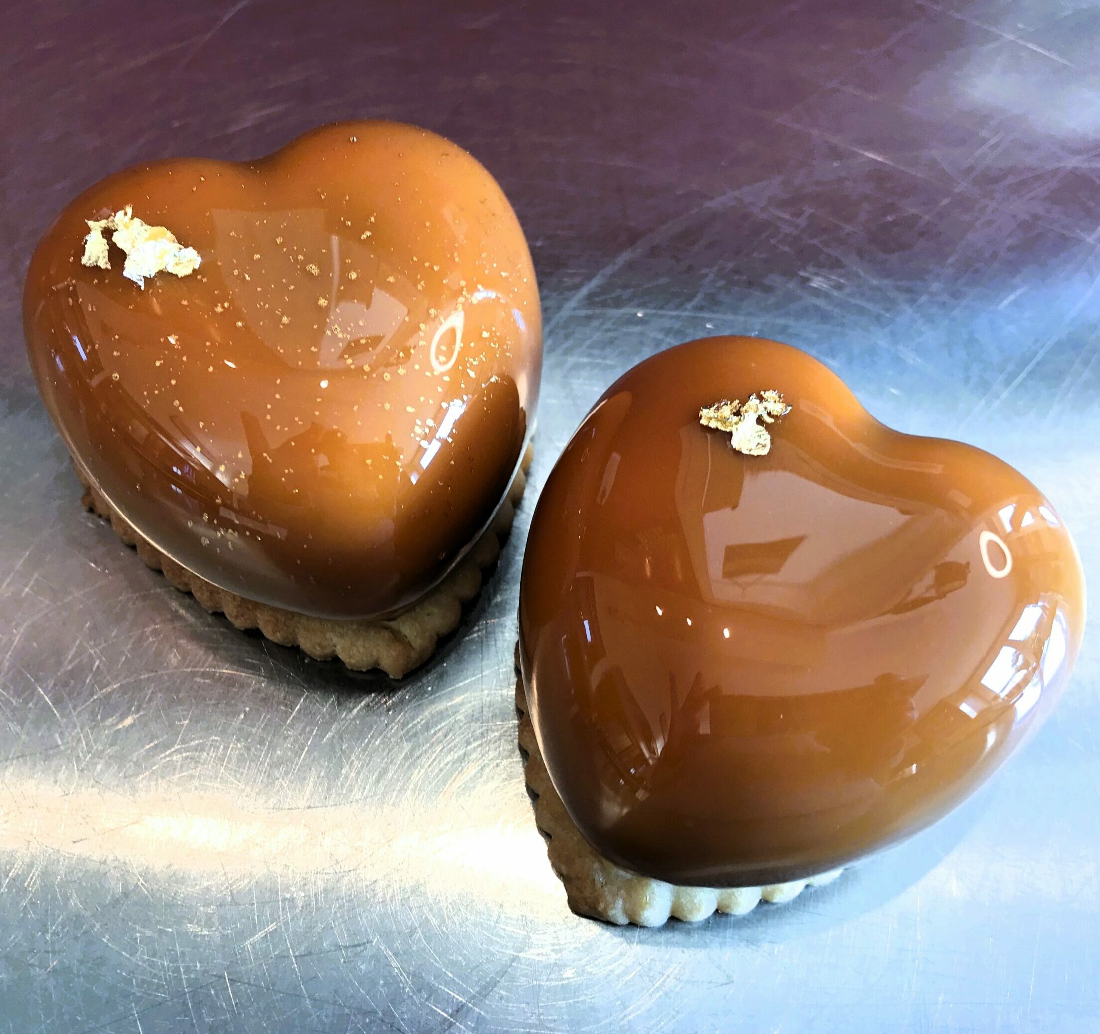 Base en pâte sucrée, biscuit dacquoise, mousse lactée au caramel, insert pomme tatin