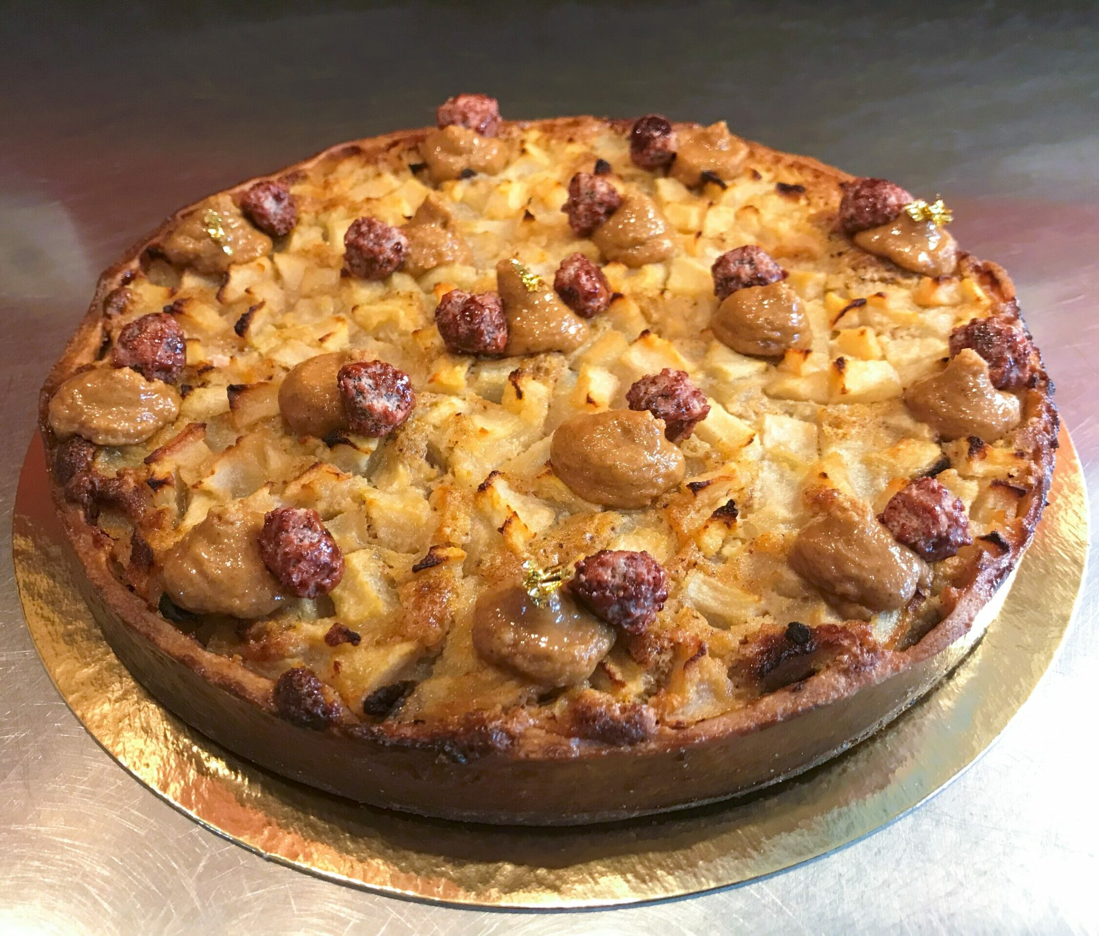Pâte sucrée, crème de noisettes, poires, pépites de chocolat noir, praliné pur aux noisettes et noisettes caramélisées