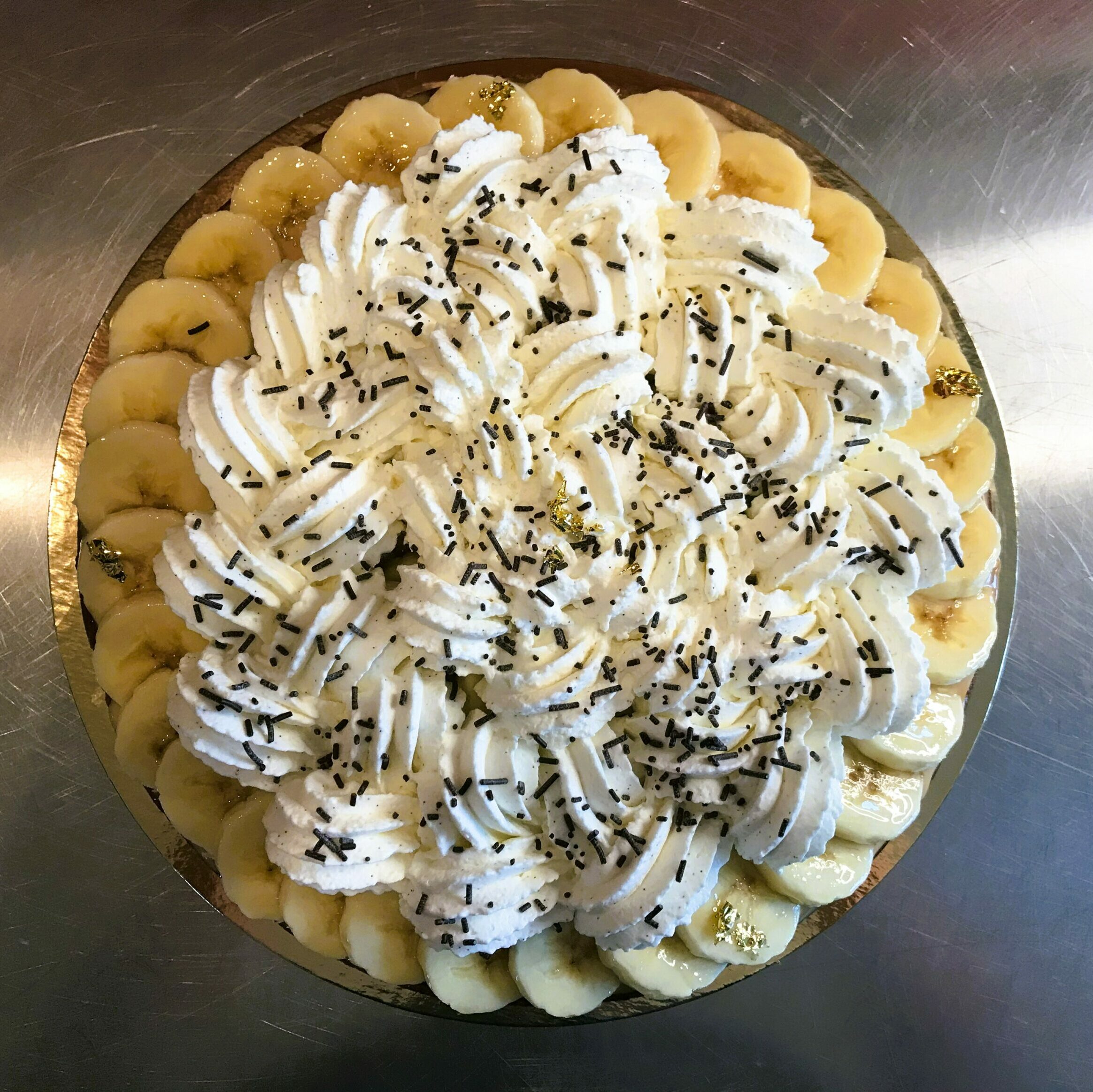 Pâte sucrée, crème d’amandes aux bananes cuites, confiture de lait maison, bananes crues et chantilly mascarpone.